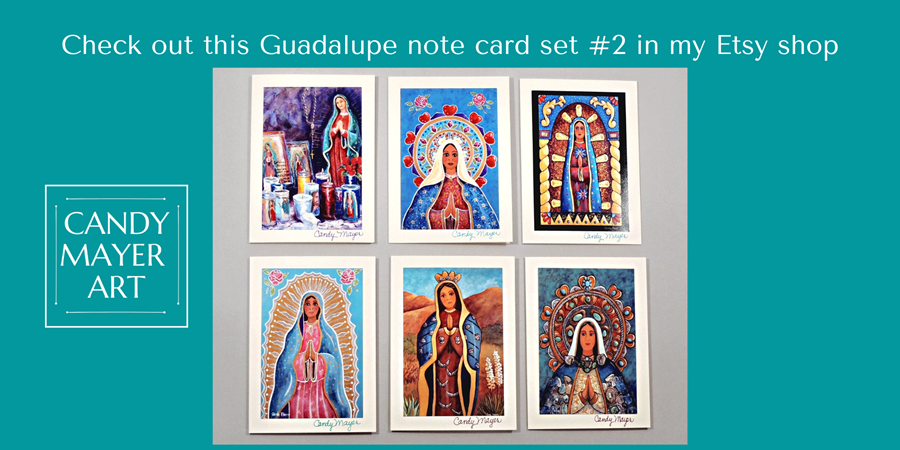If you like images of Our Lady of Guadalupe, then this new set of cards is just for you! I have chosen 6 new images of Guadalupes from my original acrylic paintings. The cards are 5″ x 7″, all six in one package. Please go to my Etsy shop to purchase them and see all my other religious paintings in prints and cards.