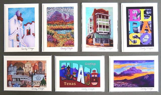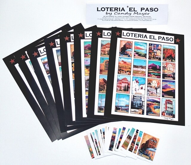 Loteria El Paso incorporates 50 different paintings from the El Paso area. Many historical landmarks are featured, such as the Downtown architecture, the unique Bhutanese buildings at UTEP, the simplicity of the Missions, the iconic Sunset Grocery, the beloved Star on the Mountain, and many more. Landscapes include the rugged the Franklin mountains, the Rio Grande, Cristo Rey mountain & statue, colorful poppies, chiles and cactus flowers.