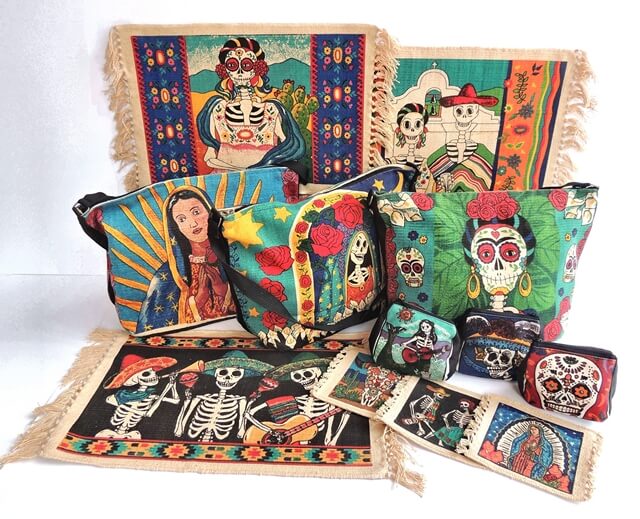 Some of my Dia de los Muertos and religious items are available as purses, totes, place mats and coin purses. They are sold at my shows, the Marketplace & the Magoffin Home. Several purses are available in my Etsy Shop.